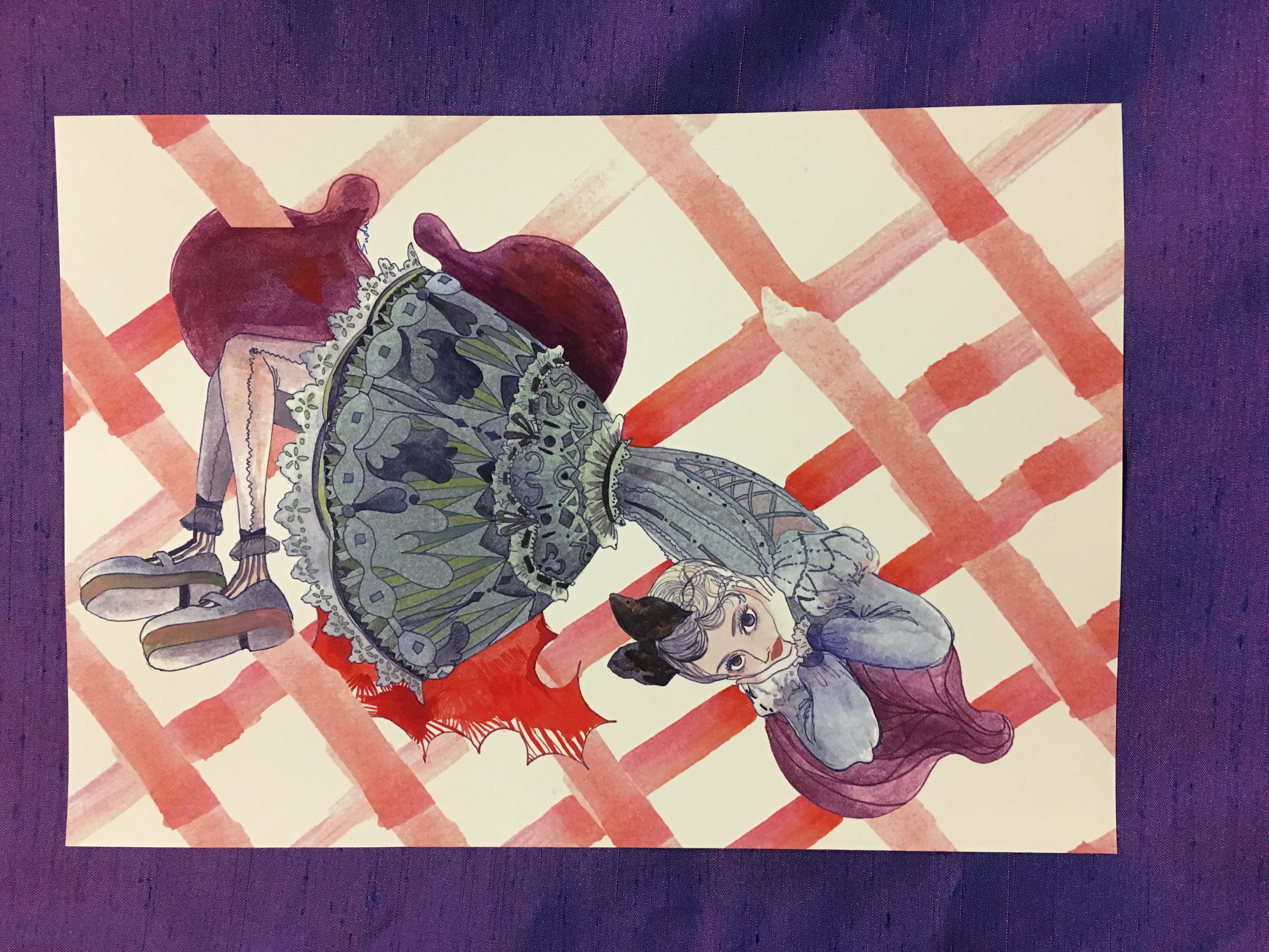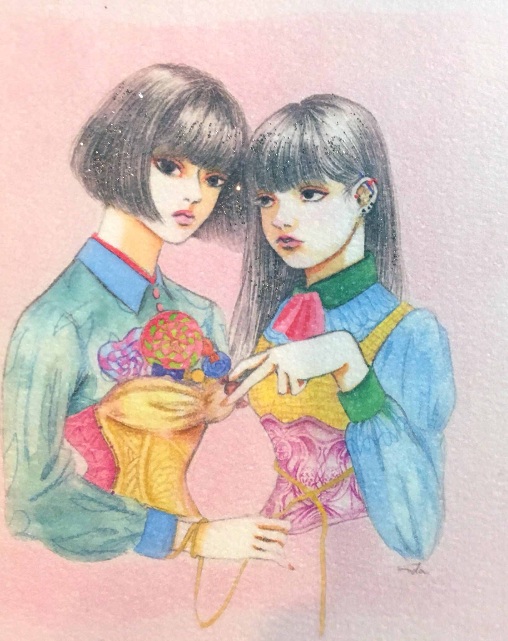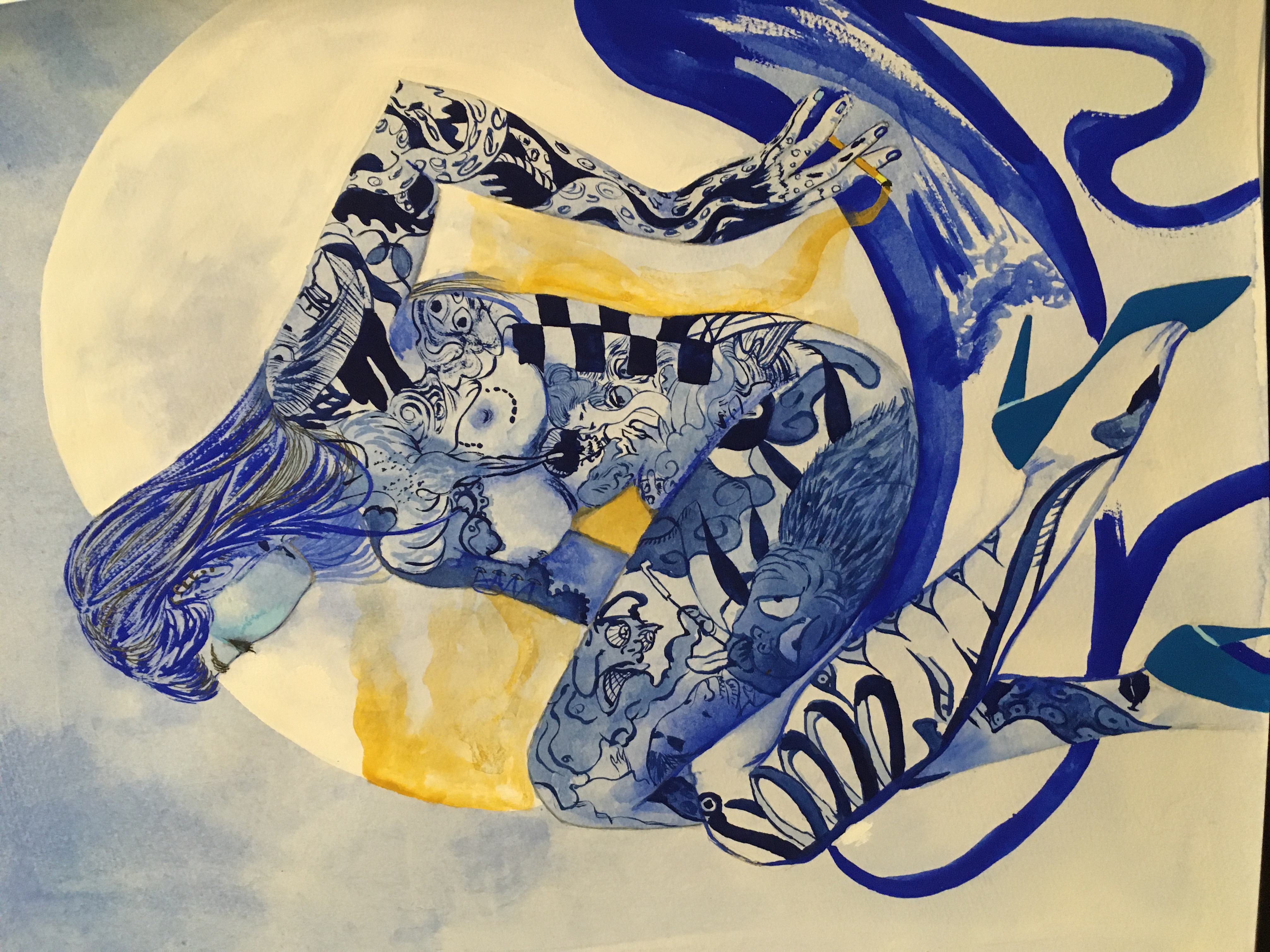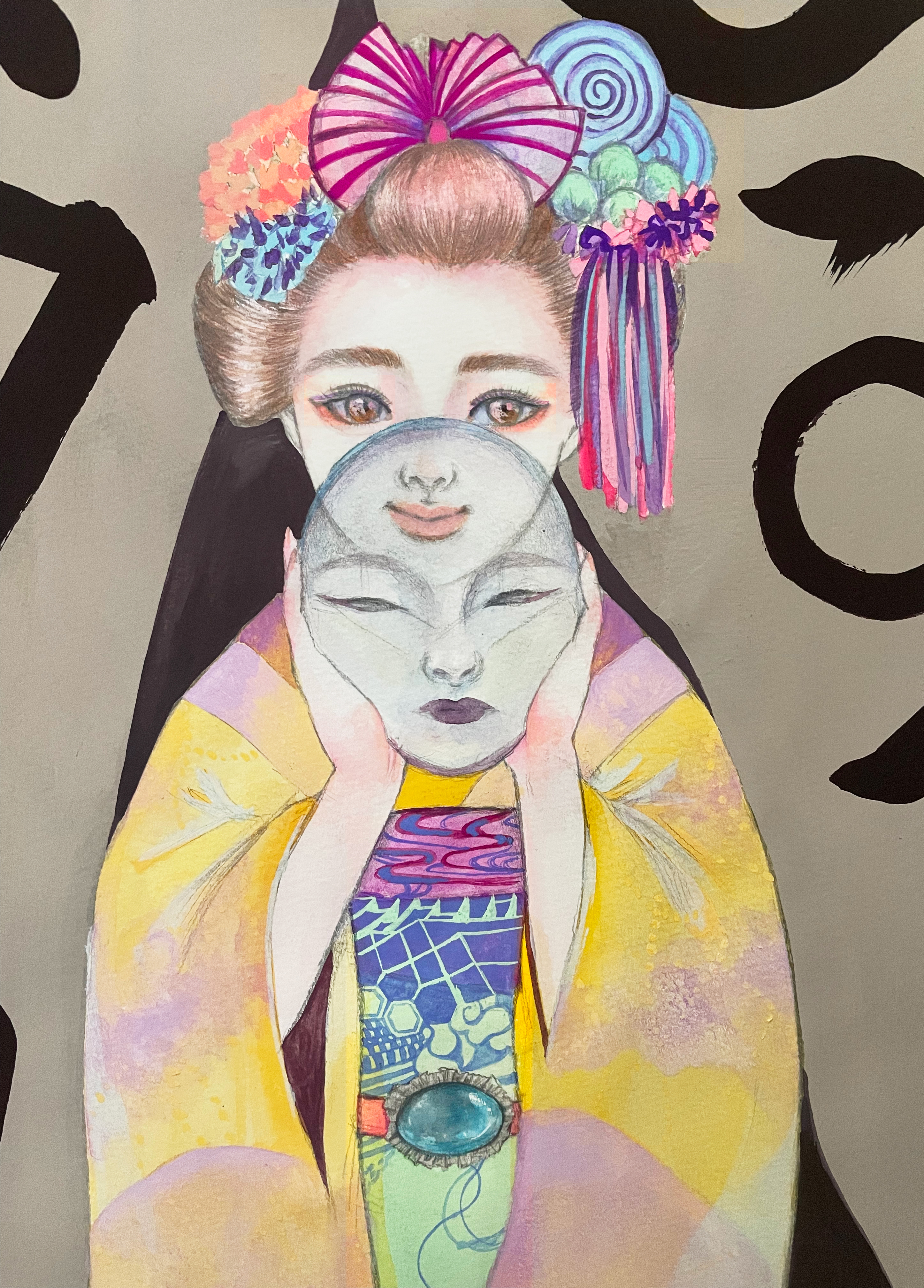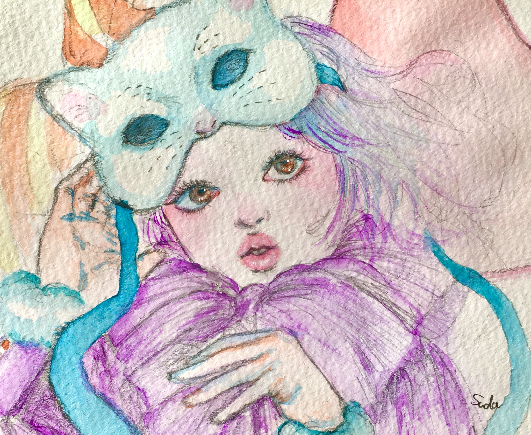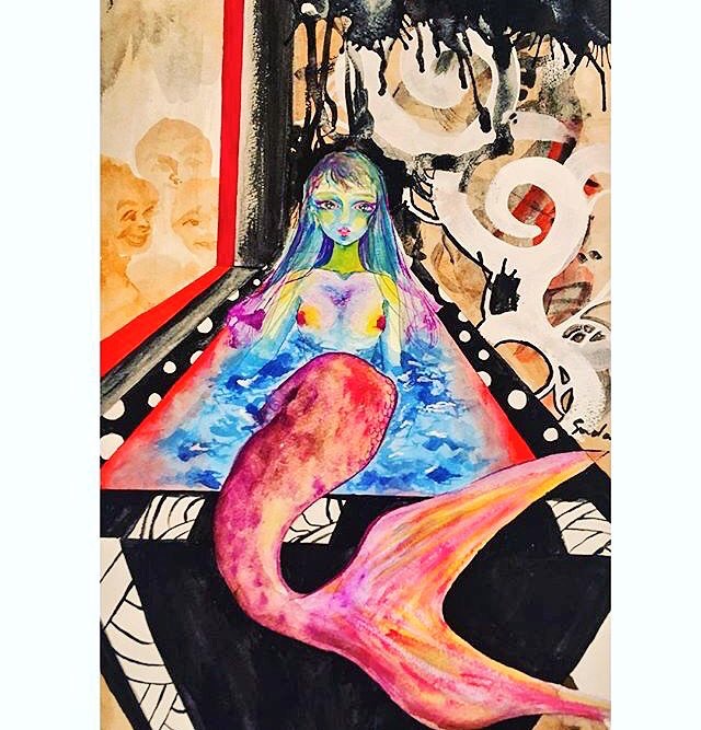 紙にアクリル、色鉛筆、ペン