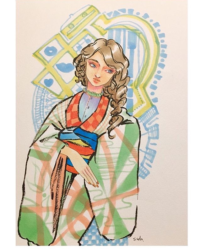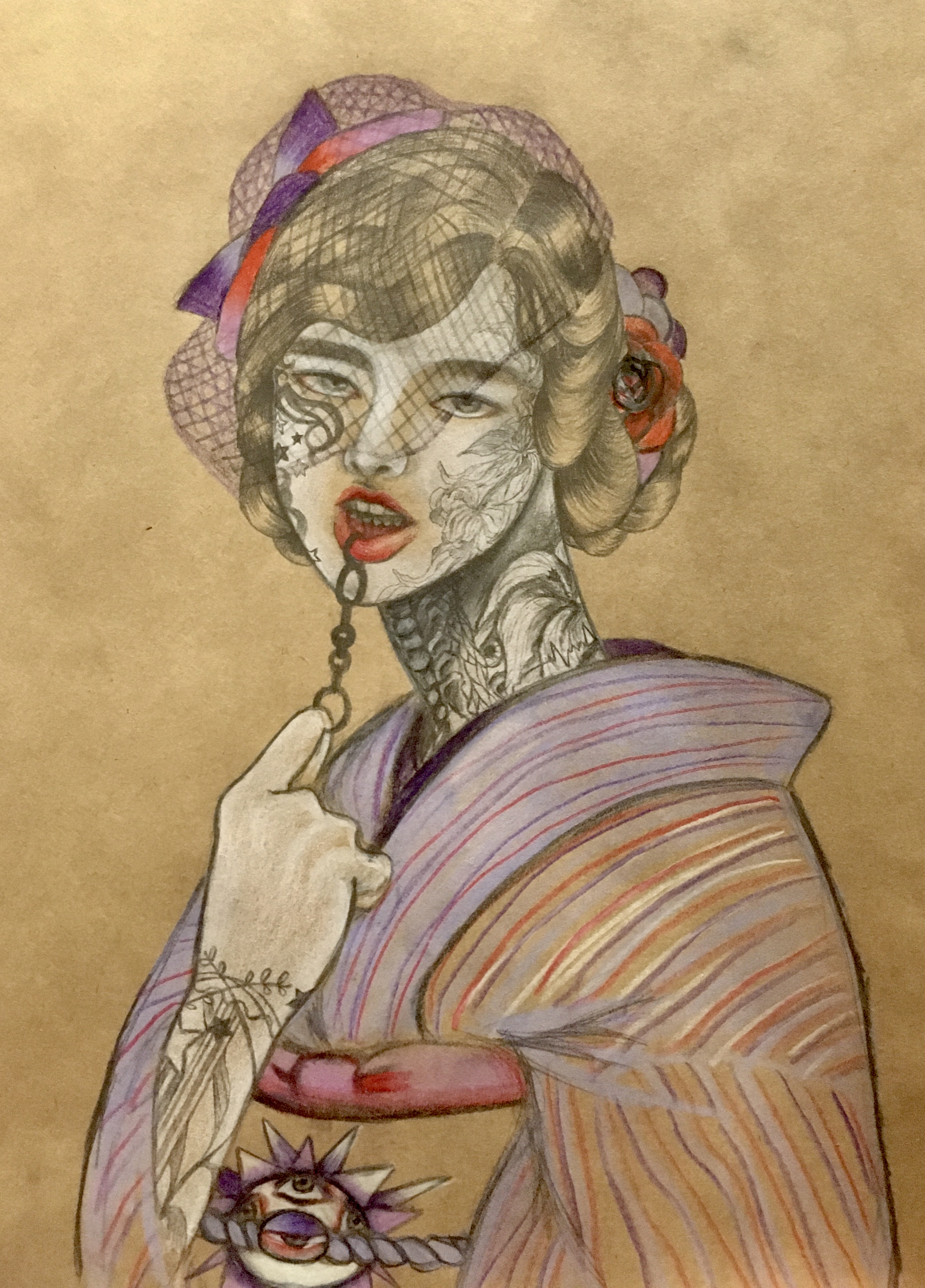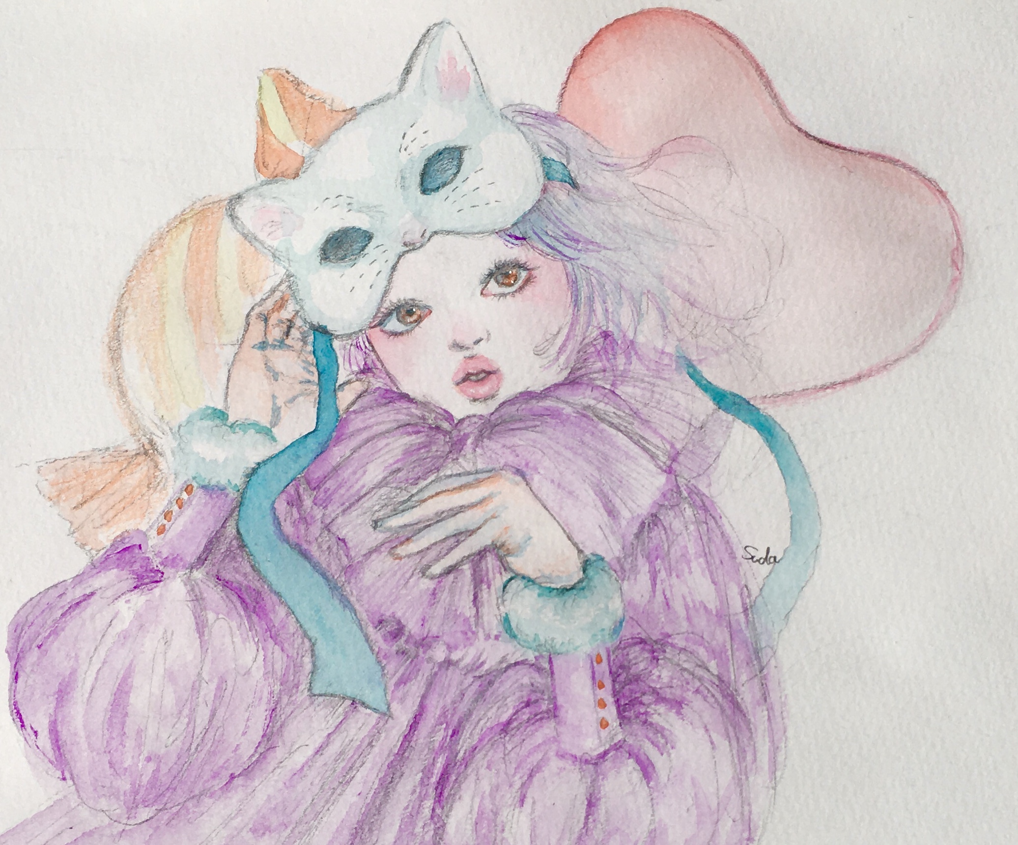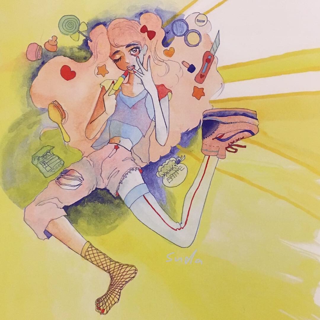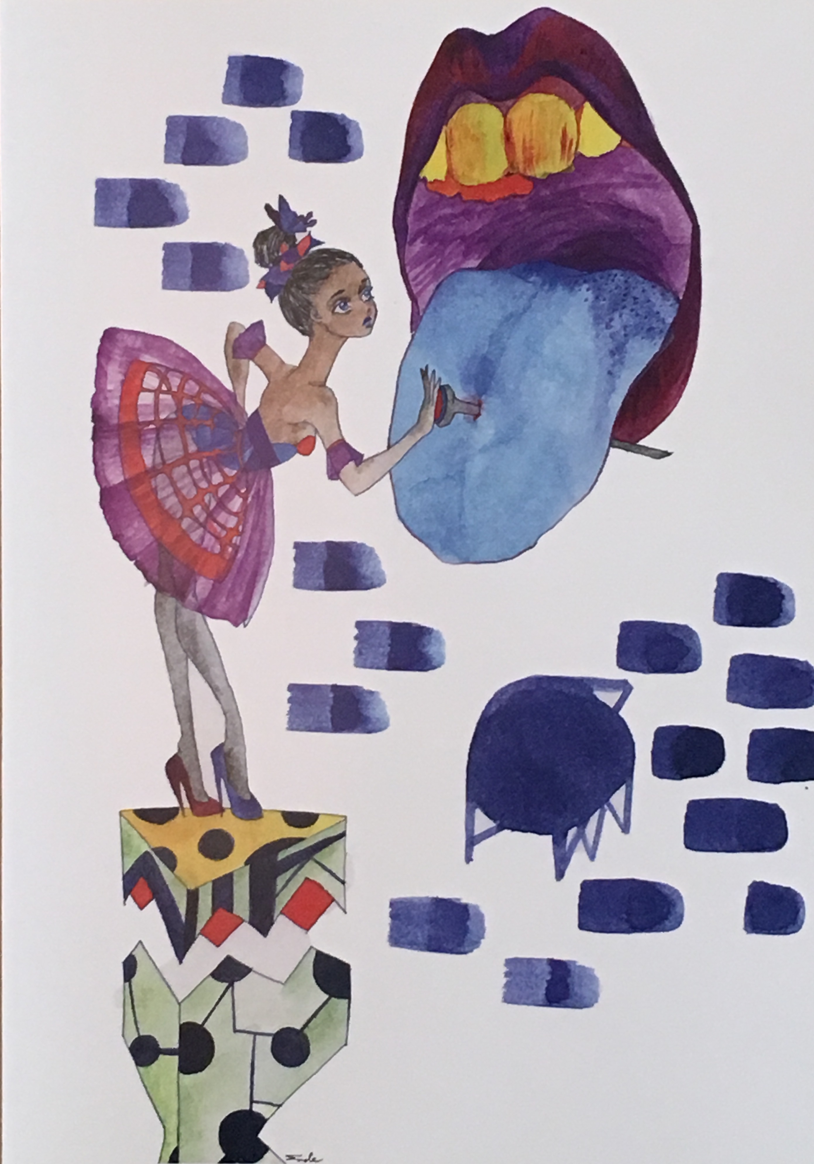 紙にアクリル、色鉛筆、ペン