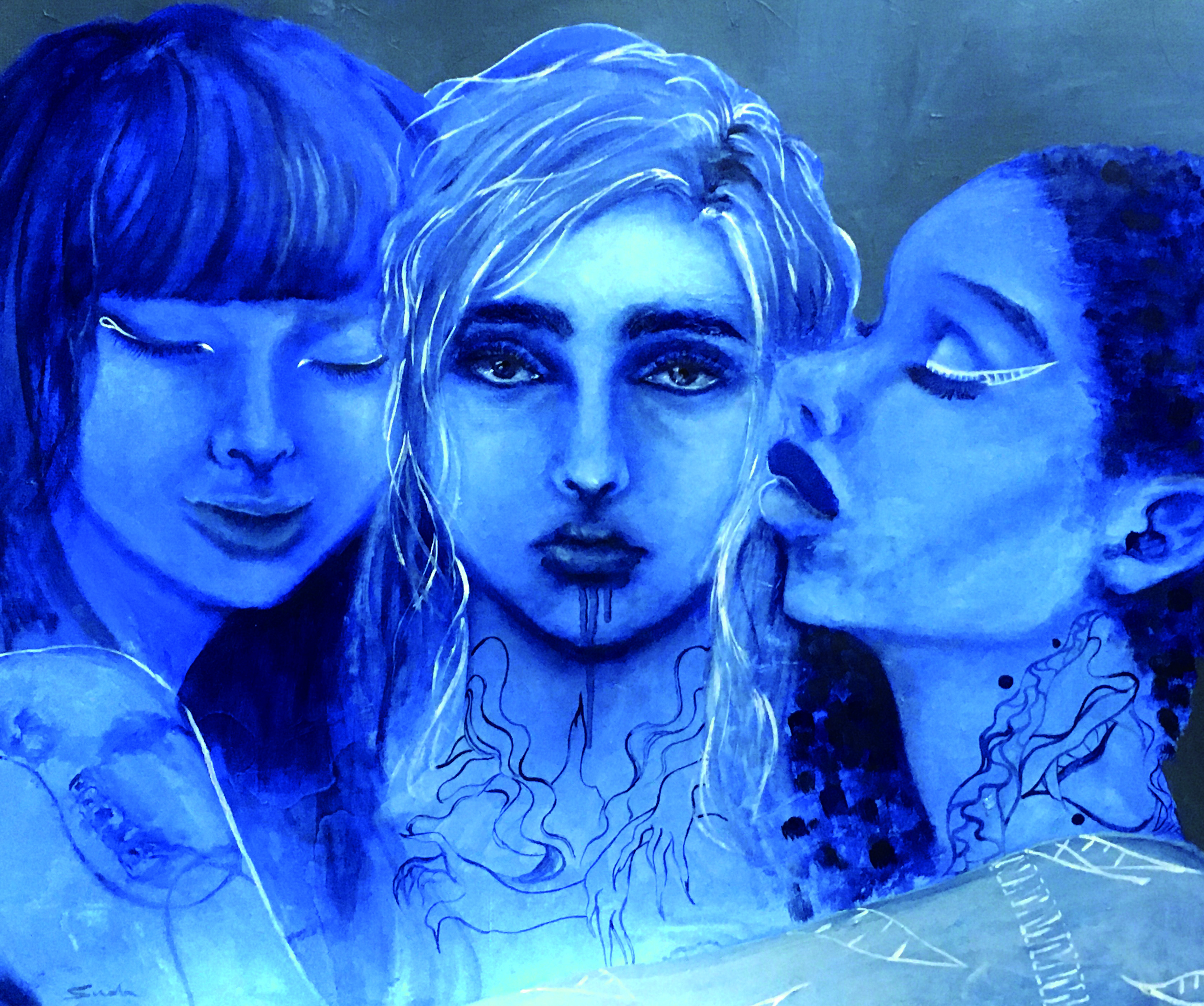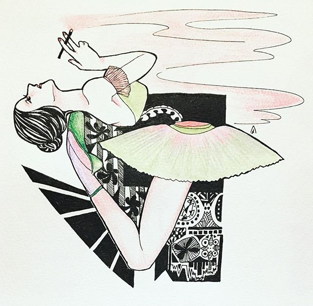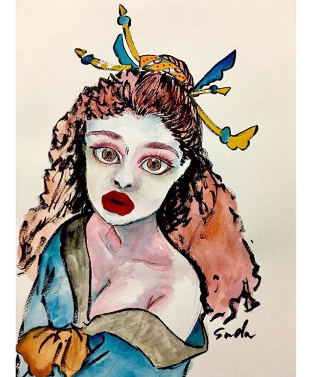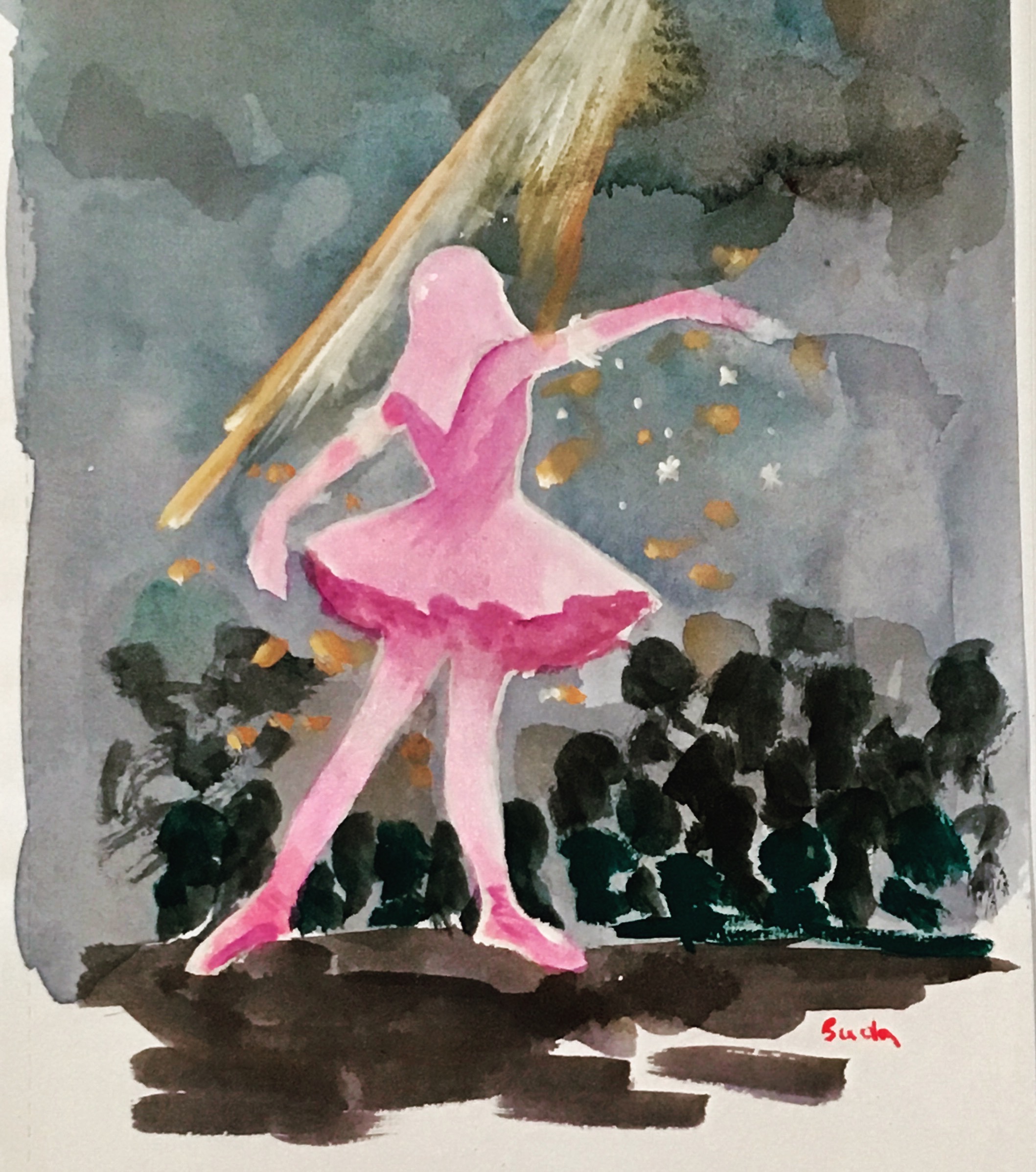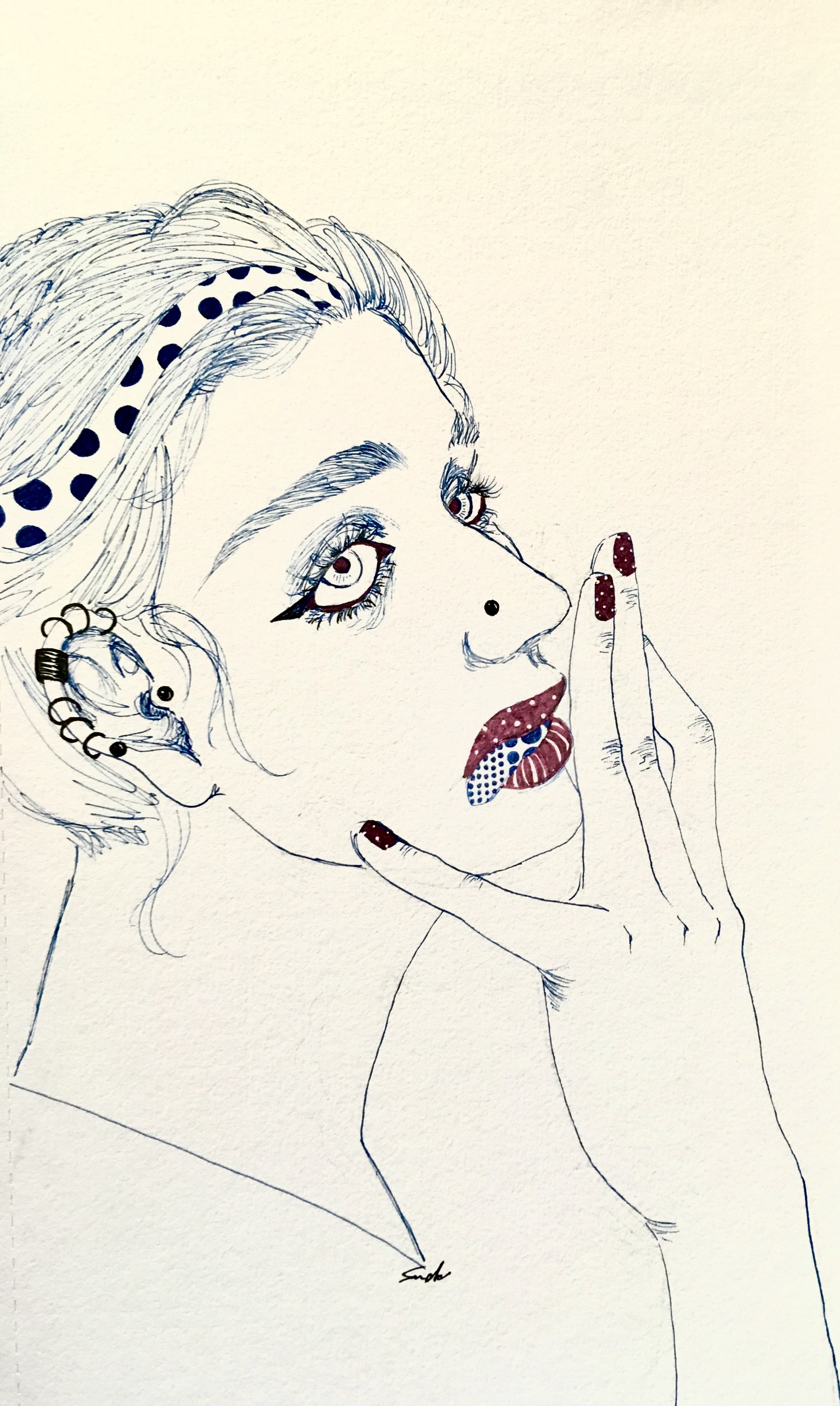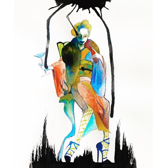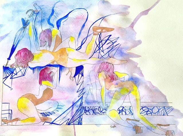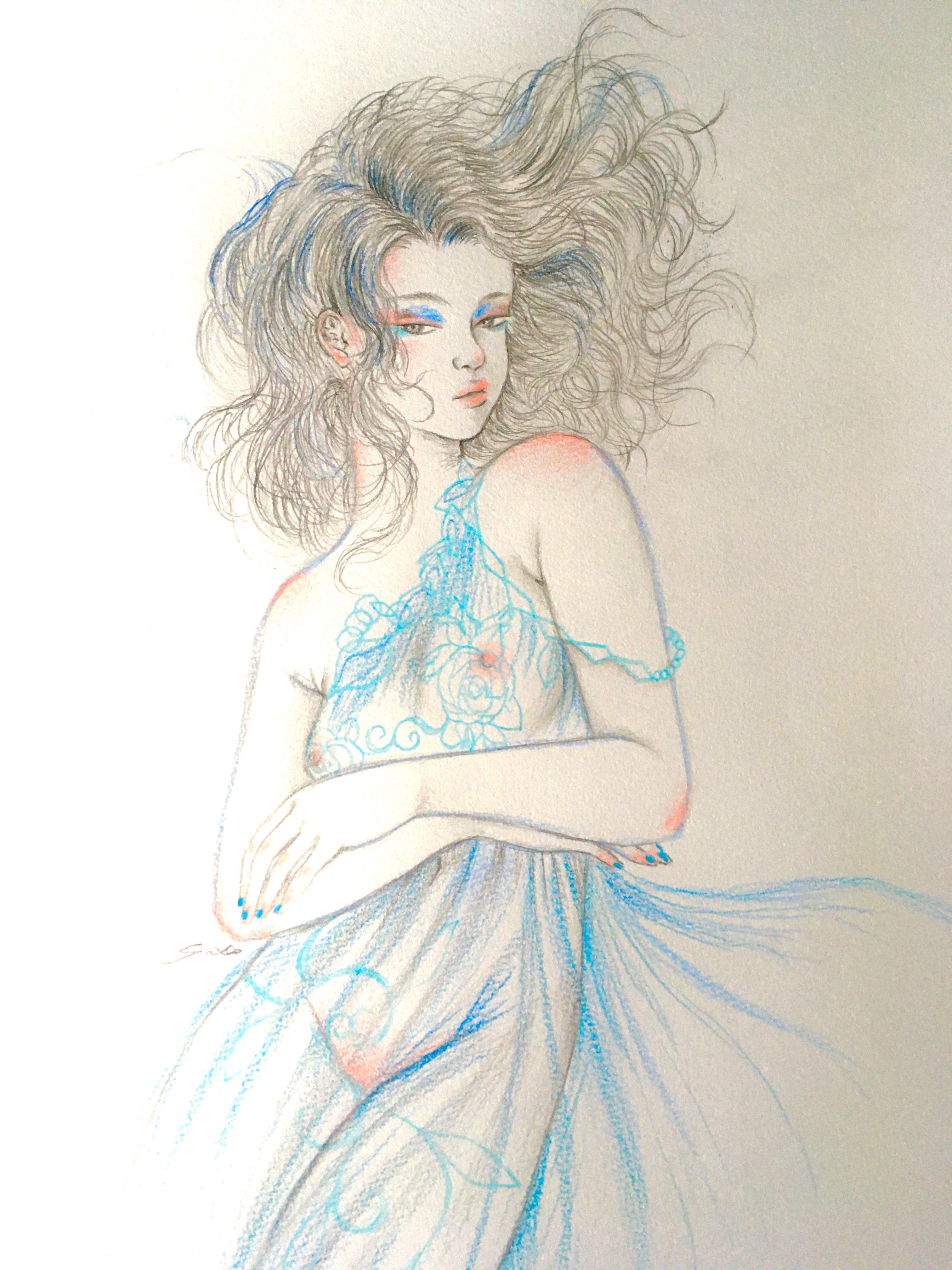 紙にアクリル、色鉛筆、ペン